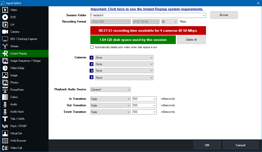 If disk space is running low, vMix Replay can automatically delete the earliest 20 minutes of the recording to continue.