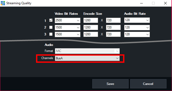 4. From Recording Setup, select BusA as the audio source and also from Streaming Settings -> Quality as shown below: