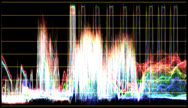 Displays a waveform of the red, green and blue colour channels on top of each other as shown below.