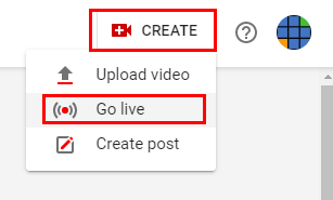 2. Up to the very top right of your screen, select the Create button and choose the Go live option. If this is your first time, you may need to wait 24 hours for YouTube to activate your account for live streaming.