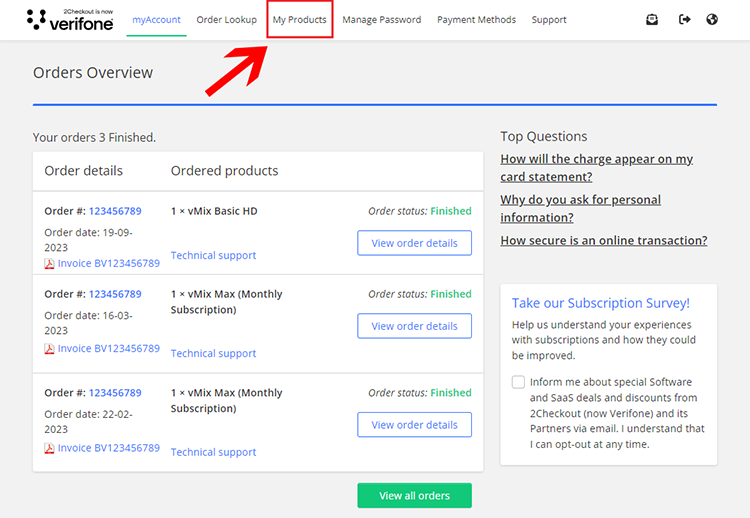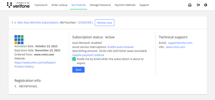Once logged in, you will see what orders are associated with your account. To manage your subscriptions or cancel auto-renewals on your vMix Max subscription, click the My Products menu item at the top.