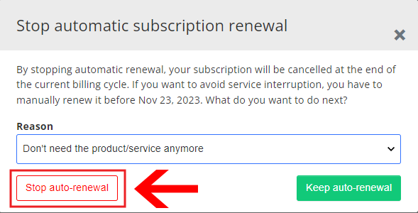 If you already have auto-renewals enabled then you will see Auto-Renewal: enabledTo cancel this, click the Stop automatic subscription renewal link.