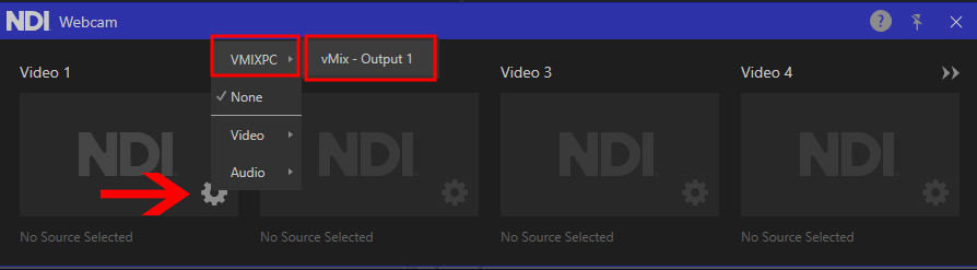 Click the cog icon button on Webcam 1. Then from the menu select your computer name -> then select vMix - Output 1.