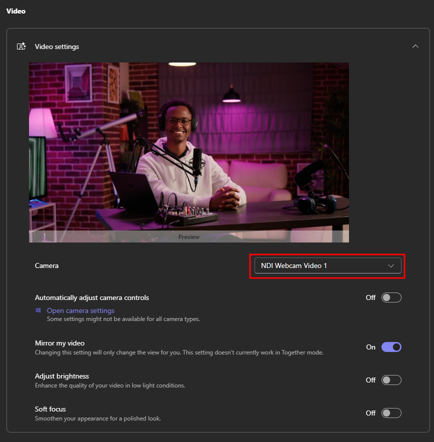From the Video section next to Camera, select NDI Webcam Video 1 from the dropdown menu.