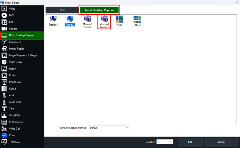 Once your guests have joined your Teams meeting or Video Call, we can now add them into vMix. To add the video, select the Add Input button from the bottom left corner. Then select the NDI / Desktop Capture tab. Choose the Local Desktop Capture button from the top. From here, select Microsoft Teams. Often it will be Microsoft Teams 2 depending on how many windows you have open in Teams. Select one till you find the correct one showing your meeting/call.
