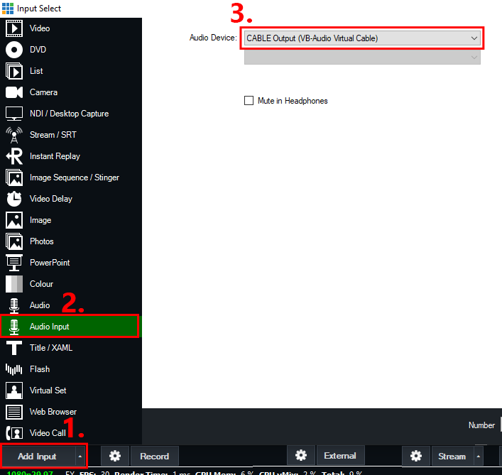 Next we will add the audio coming from Teams. Select the Add Input button from the bottom left corner. Then select the Audio Input tab. From the Audio Device drop down menu choose CABLE Output (VB-Audio Virtual Cable). Then press OK.