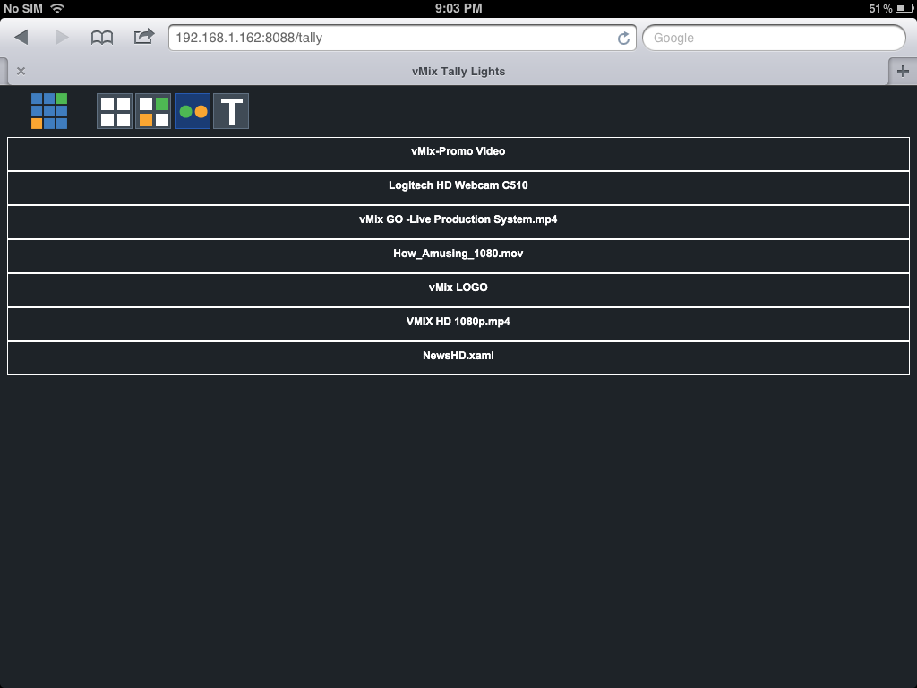 The vMix Web Controller interface is a compact version of your actual vMix interface. It is compact so that it can be used on even the smallest of Smartphone screens. The interface has 4 different screens- Shortcuts, Controller, Tally Lights and Titles. These can be changed by clicking the icons along the top.