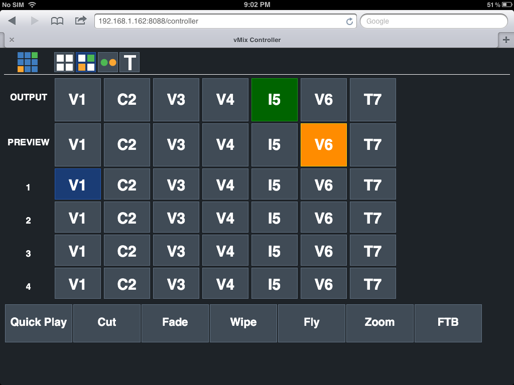 The Controller screen represents your actual vMix interface. Each of the boxes represent your inputs. The letter refers to the type of input and the number represents the input number in vMix. For example-
