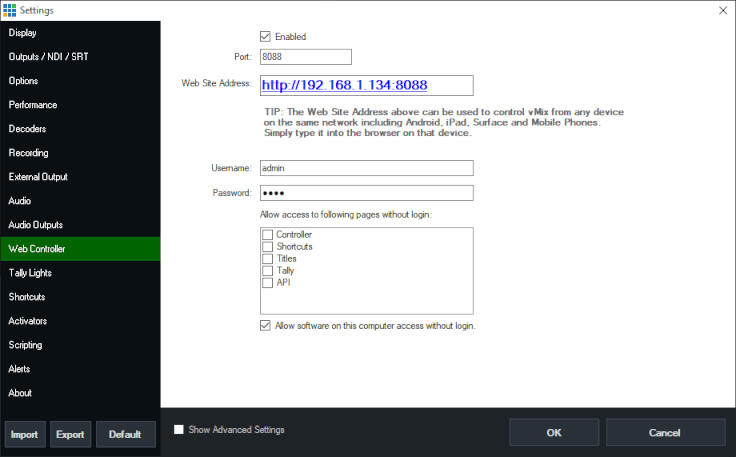 Firstly, open up the settings section of vMix and click on the vMix Web Controller tab. Tick the top box to enable it. The default port for use is 8088. Only change this if you're an advanced user and understand network protocols.