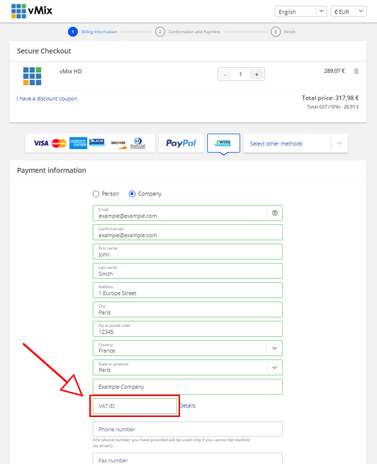 If you are a EU business with a current VAT ID, you can purchase the vMix software without paying tax by entering in the ID on the purchase page as shown below.