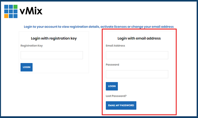 2. Login to your vMix Account using the second box titled "Login with email address" and enter in the same Email Address used to registered the key to. This will be the email address entered when purchasing the key unless the email has been changed via the vMix Account since purchase.
